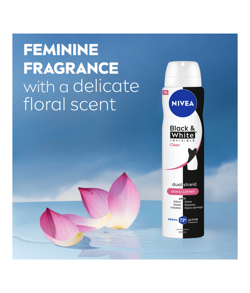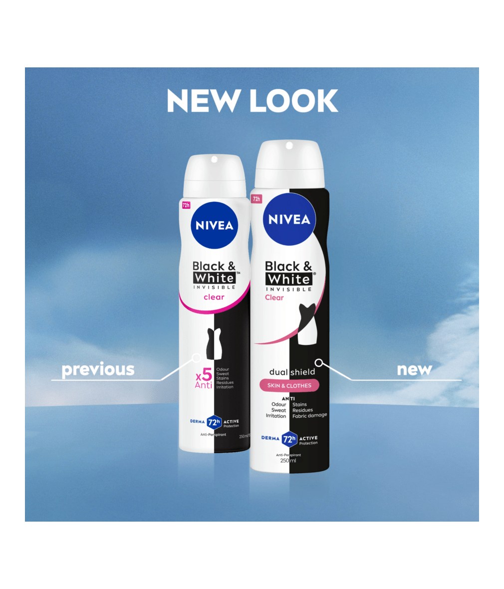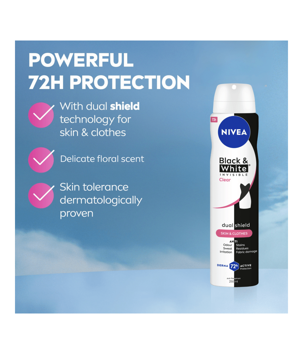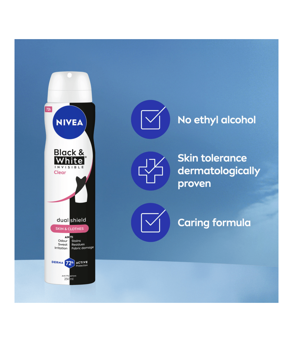 NIVEA BLACK & WHITE INVISIBLE, with Dual Shield technology, provides white mark protection on black clothing & anti-yellow staining on white clothing. Reliable 72H sweat & odour anti-perspirant, that protects your skin & clothes.