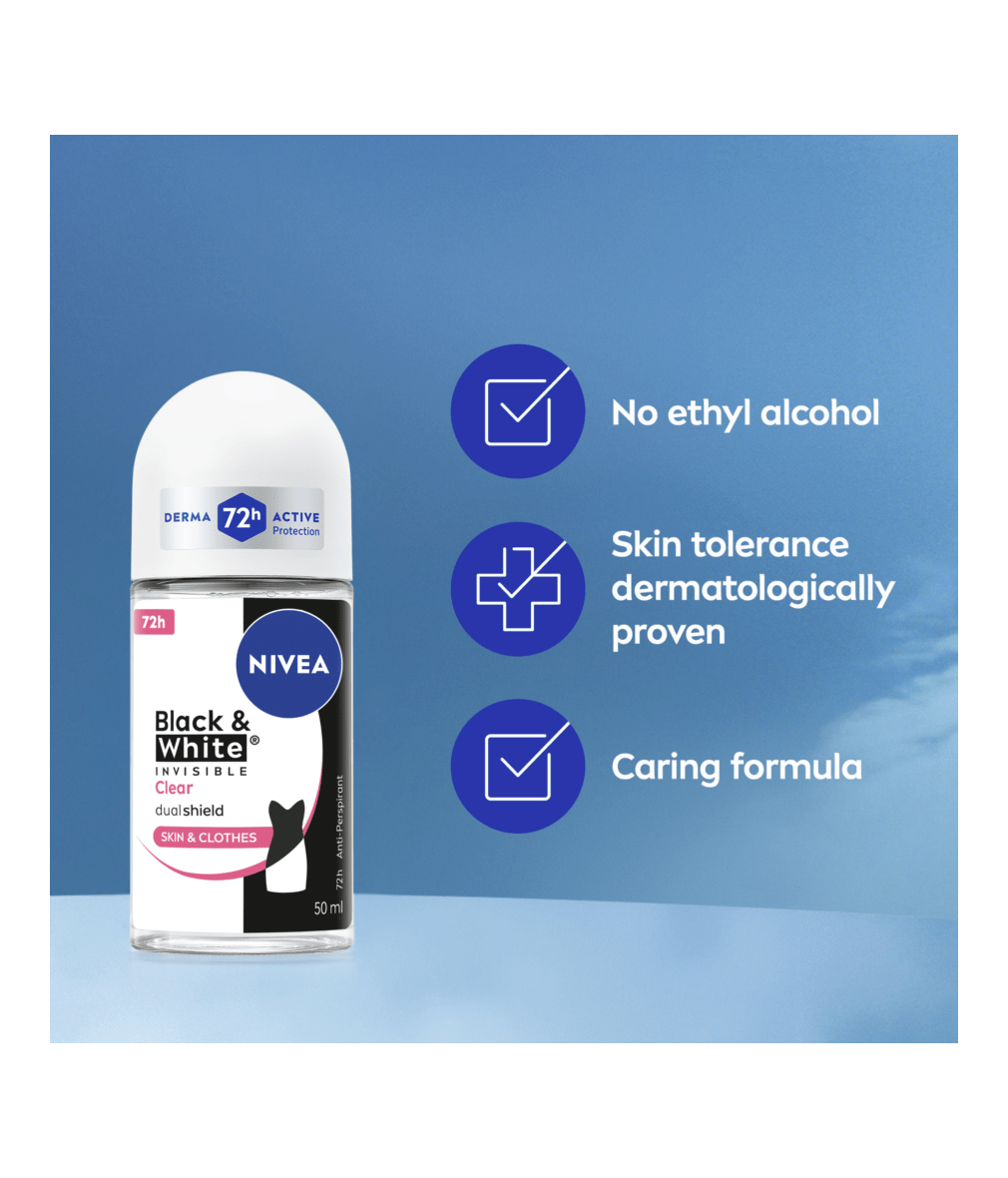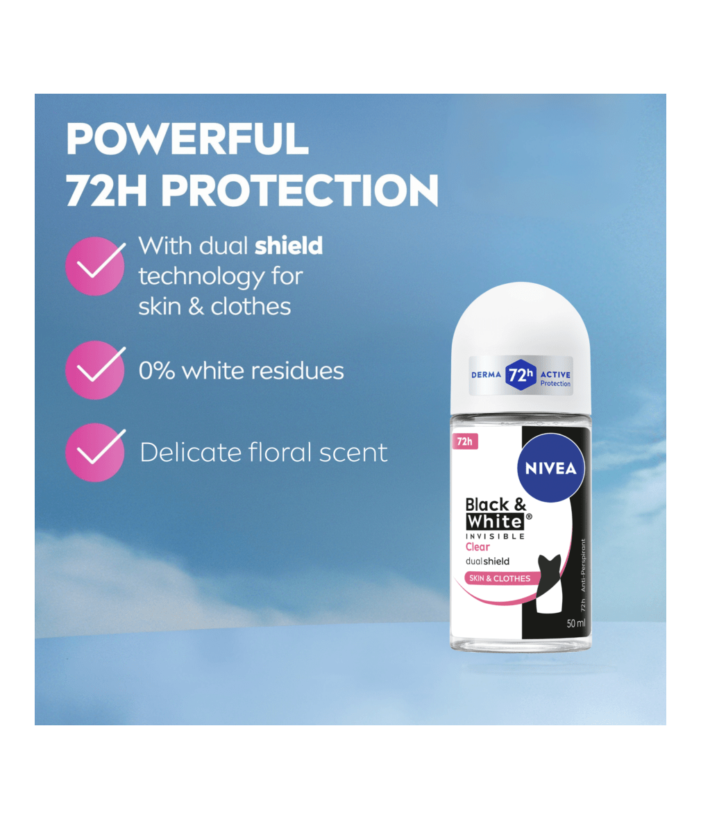 NIVEA BLACK & WHITE INVISIBLE, with Dual Shield technology, provides white mark protection on black clothing & anti-yellow staining on white clothing. Reliable 72H sweat & odour anti-perspirant, that protects your skin & clothes.