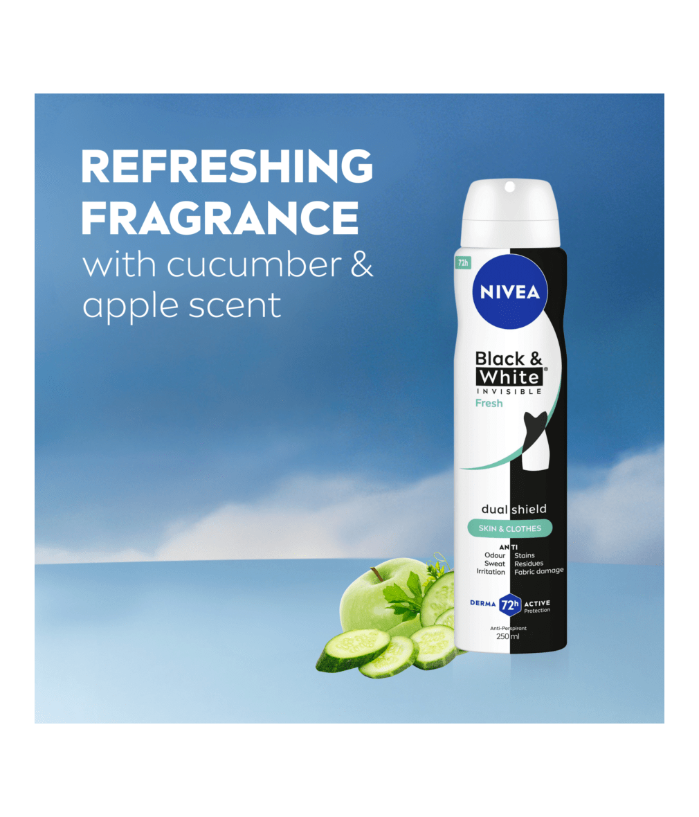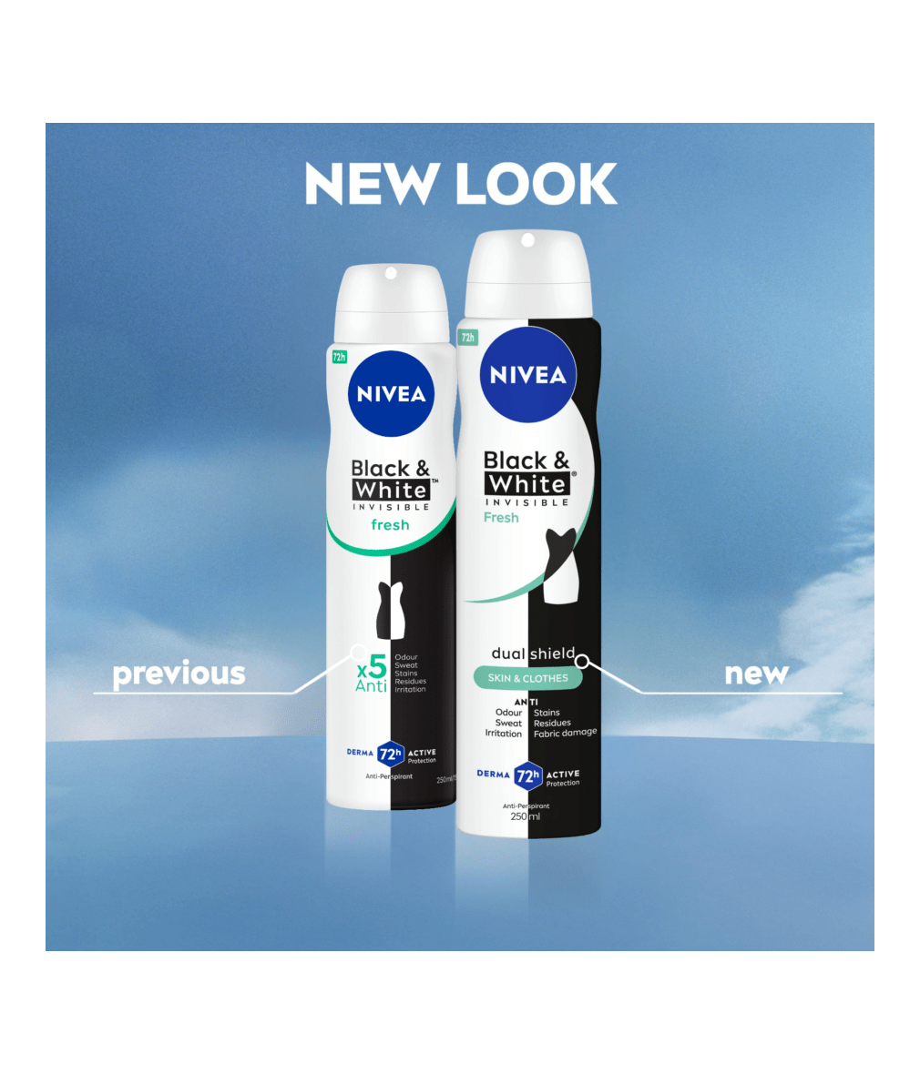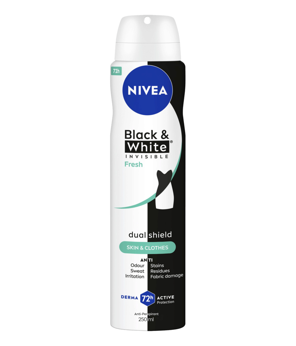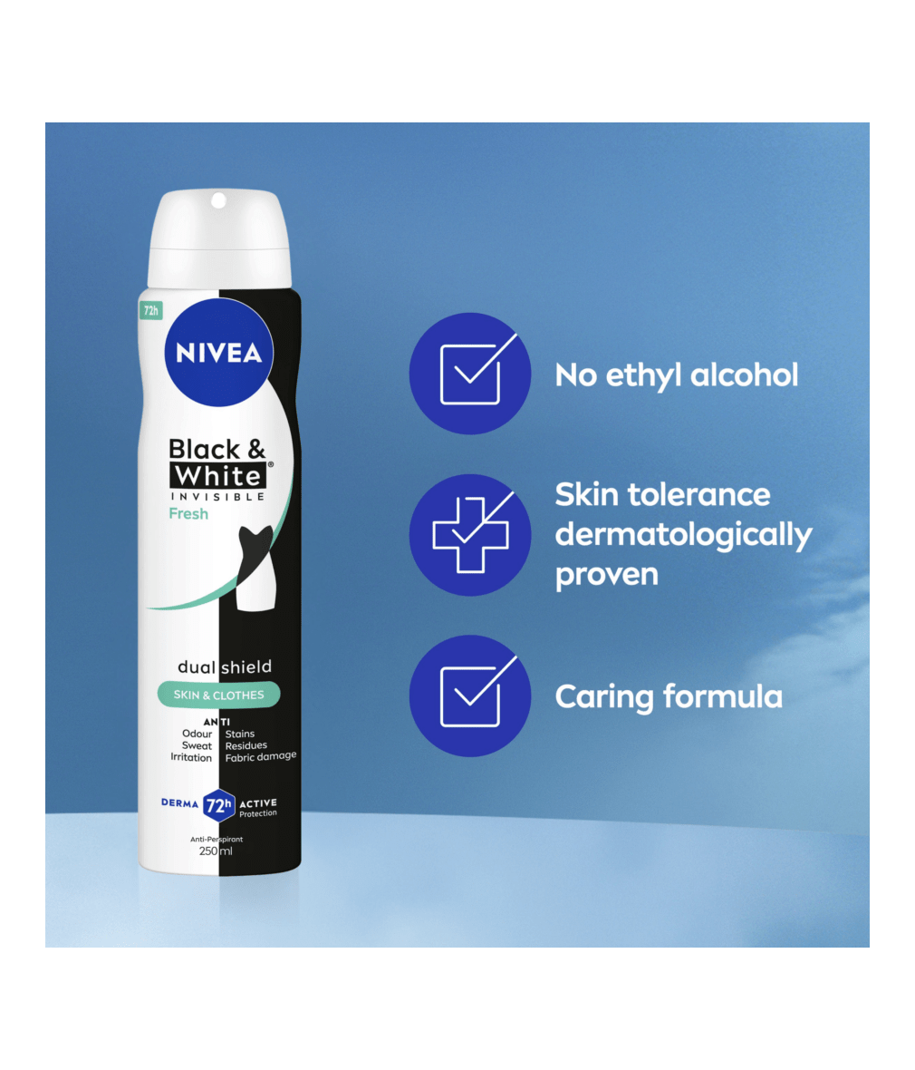 NIVEA BLACK & WHITE INVISIBLE, with Dual Shield technology, provides white mark protection on black clothing & anti-yellow staining on white clothing. Reliable 72H sweat & odour anti-perspirant, that protects your skin & clothes.