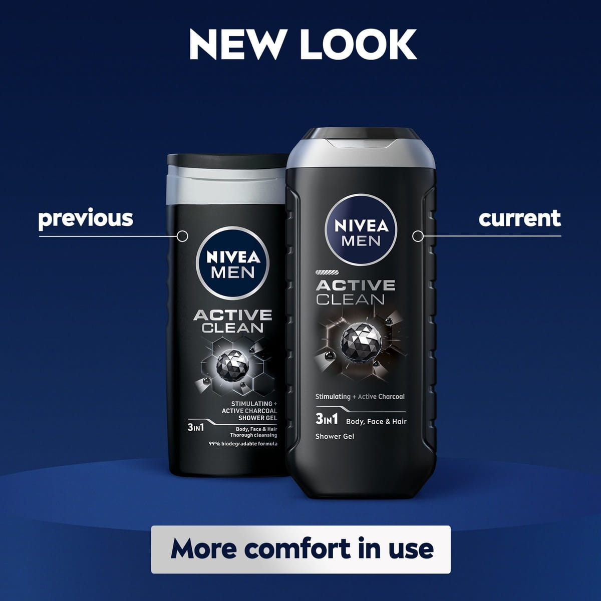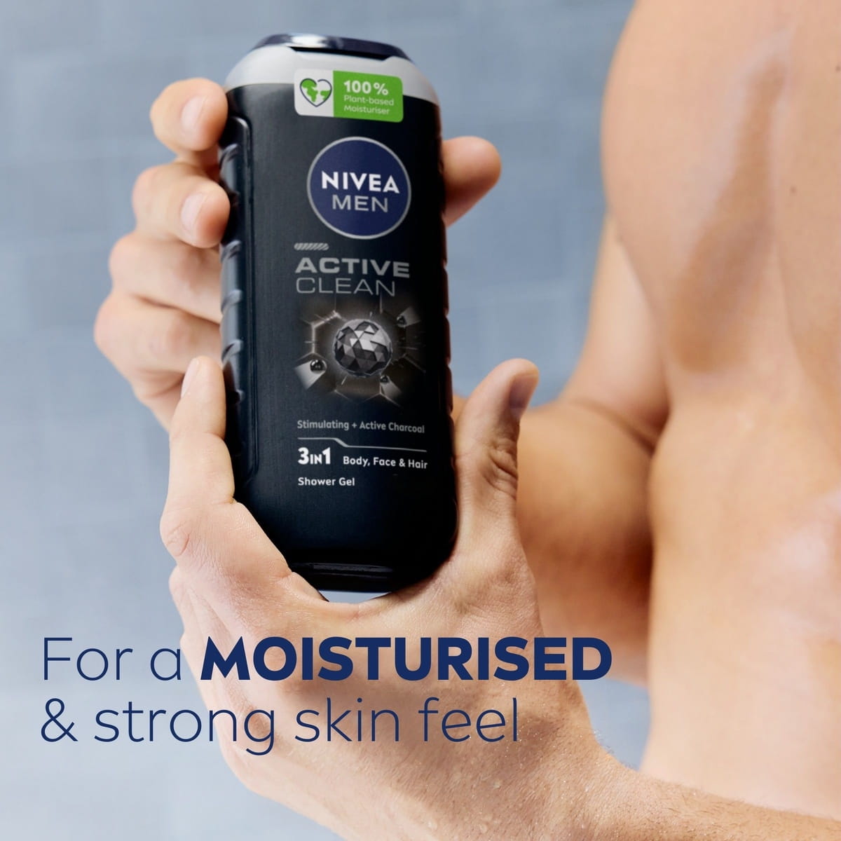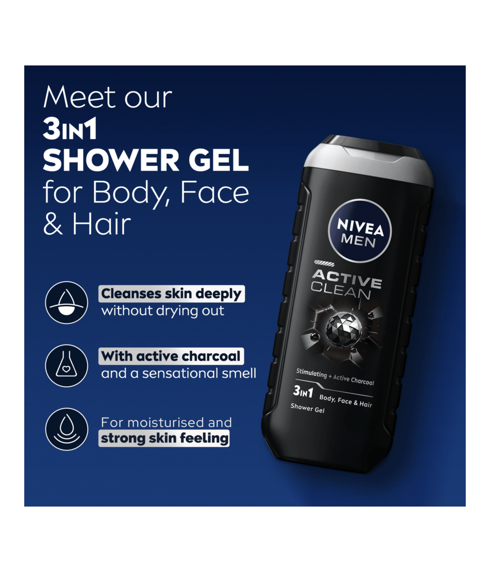 Get an effective clean without drying out your skin, face and hair with NIVEA MEN Active Clean Shower Gel and Body Wash. An innovative shower gel especially made for men to cleanse the skin mildly and effectively. Skin and hair feel revitalised and cared for.