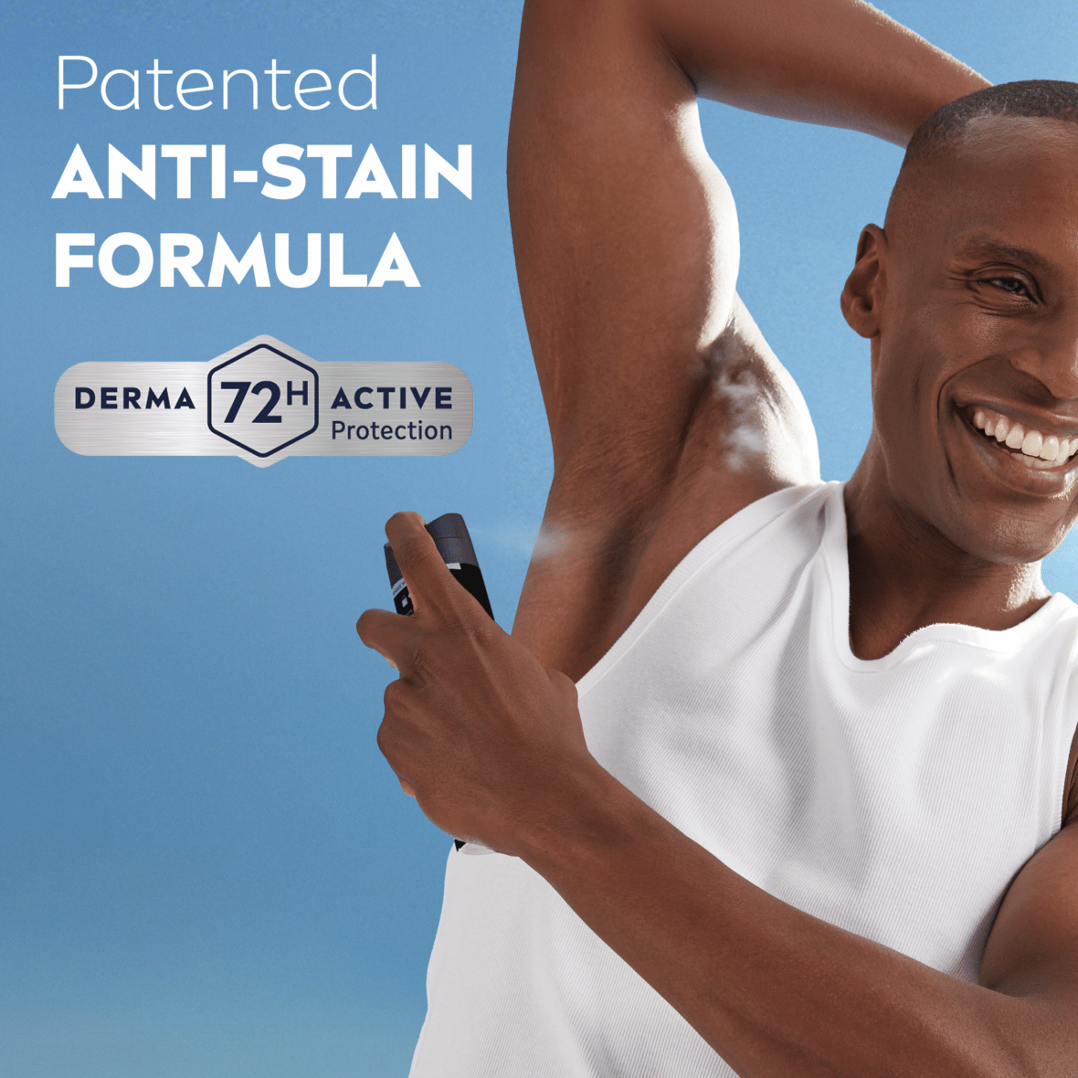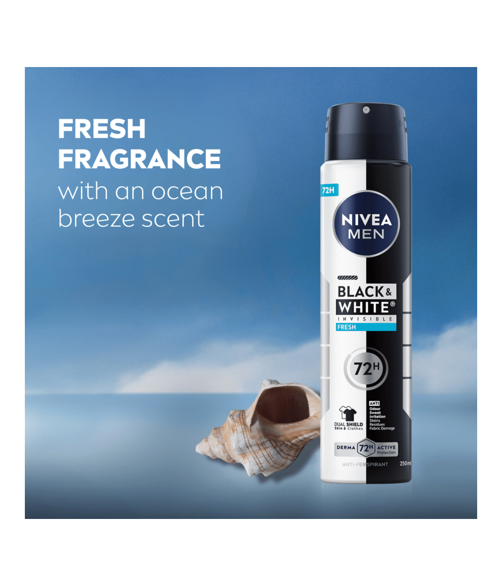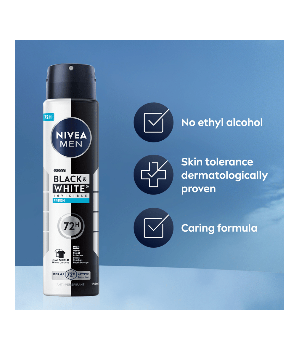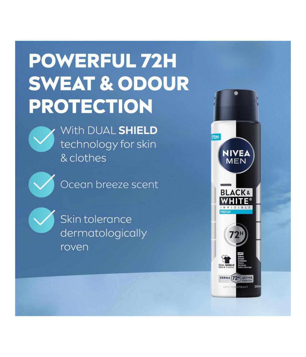 NIVEA MEN BLACK & WHITE INVISIBLE, with Dual Shield technology, provides white mark protection on black clothing & anti-yellow staining on white clothing. Reliable 72H sweat & odour anti-perspirant, that protects your skin & clothes.