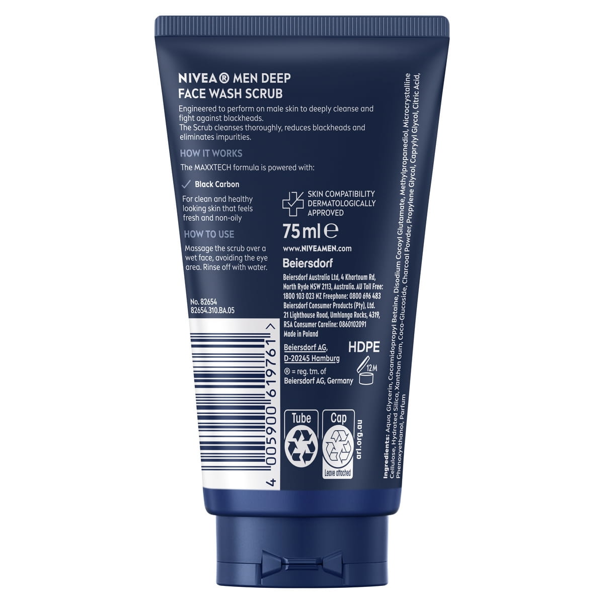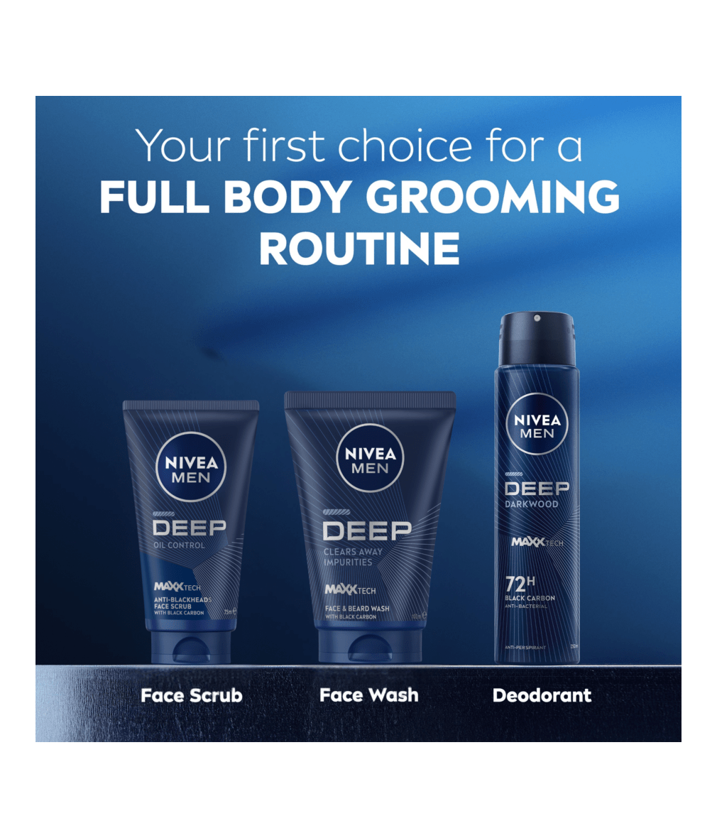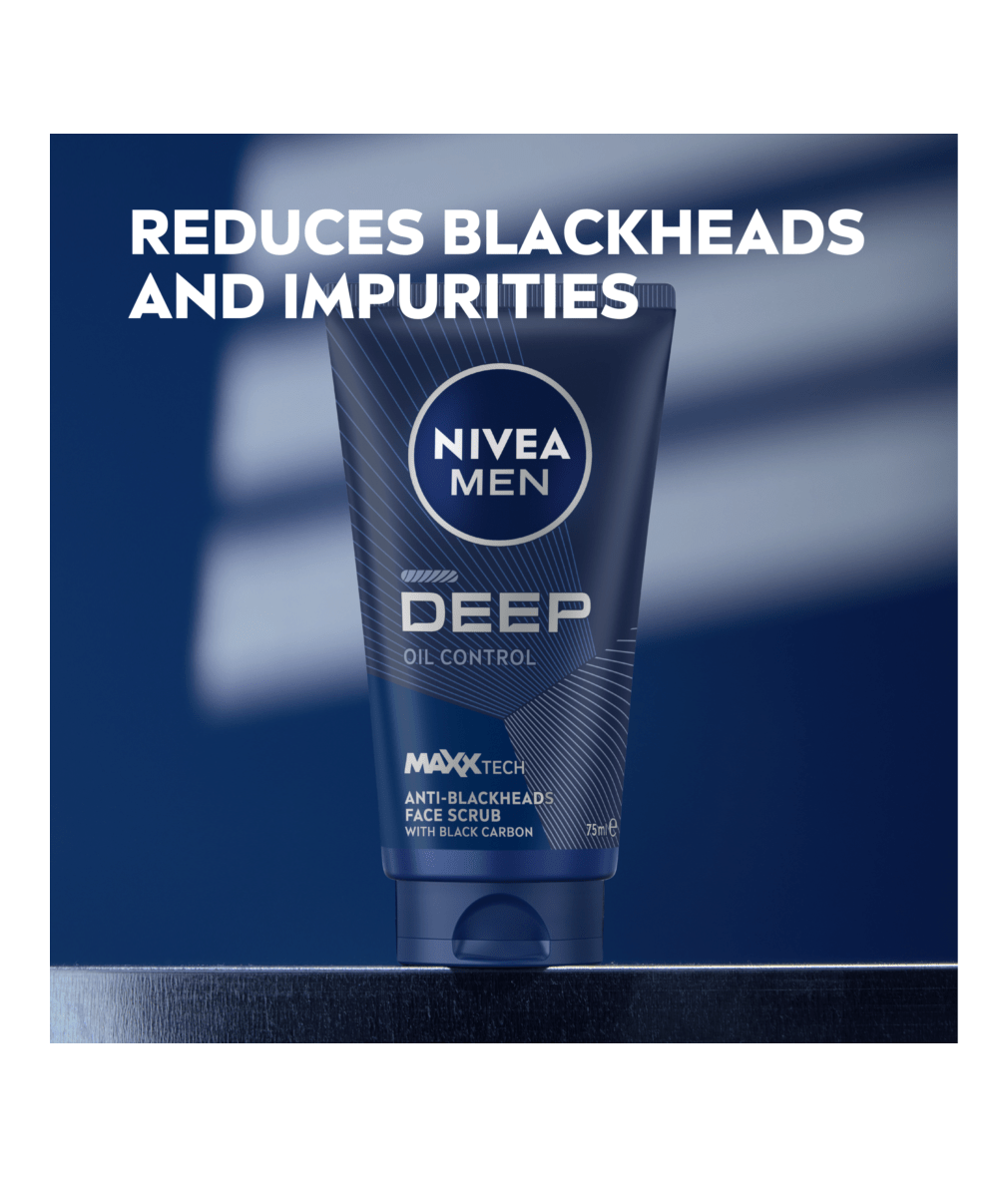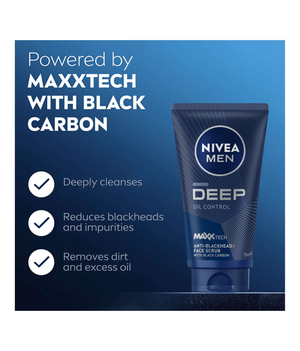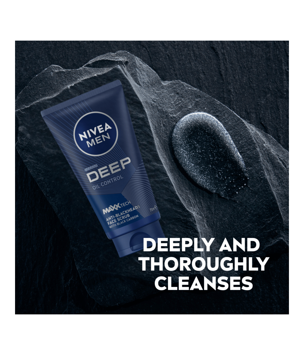 NIVEA MEN DEEP Oil Control Anti-Blackheads Face Scrub, With the help of Black Carbon and powered with MAXXTECH, this face scrub deeply cleanses your skin and reduces blackheads and impurities. The result: Your skin will be clean and healthy-looking.