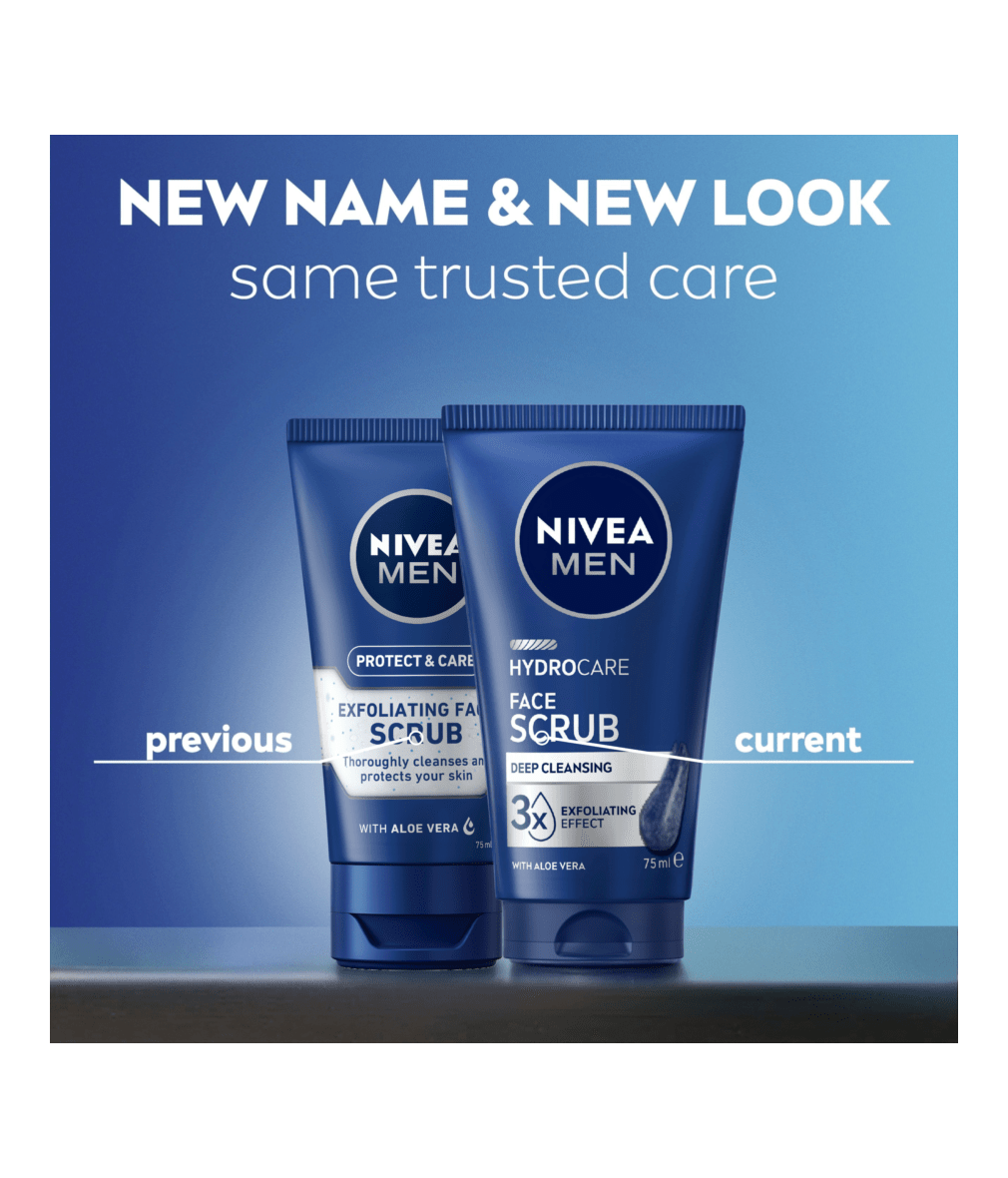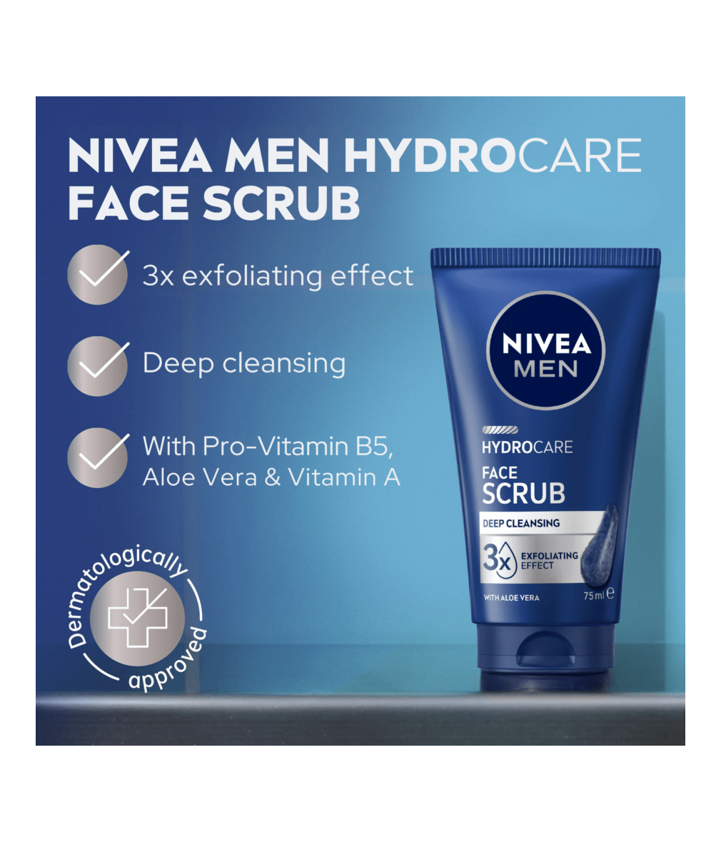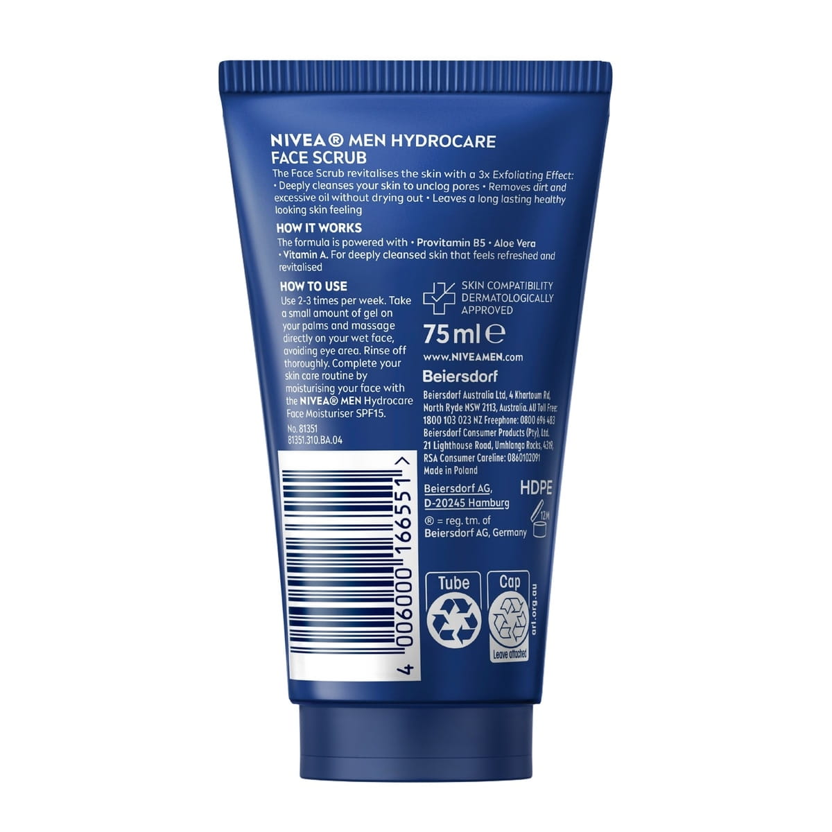 NIVEA MEN Hydrocare Face Scrub - This face scrub clears your skin thoroughly yet mildly. The formula with Aloe Vera unclogs your pores and clears away excess oils and impurities. Your skin will feel thoroughly clean and healthy.