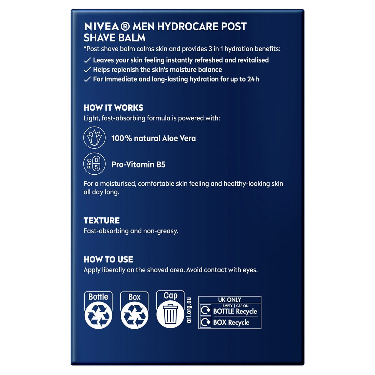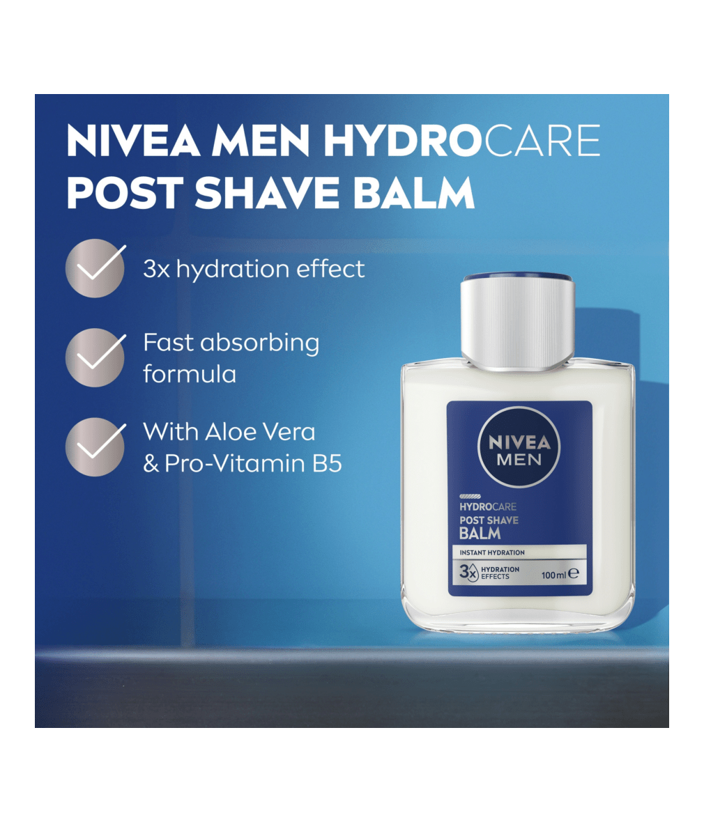 Give your shaved face the instant relief it deserves with NIVEA MEN HYDROCARE Post Shave Balm. Made with Aloe Vera and Pro-Vitamin B5, the formula cares for your skin and protects it from external influences causing dryness, leaving your skin looking healthy and cared for.