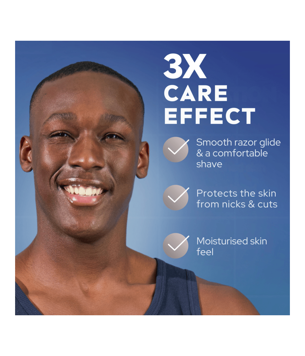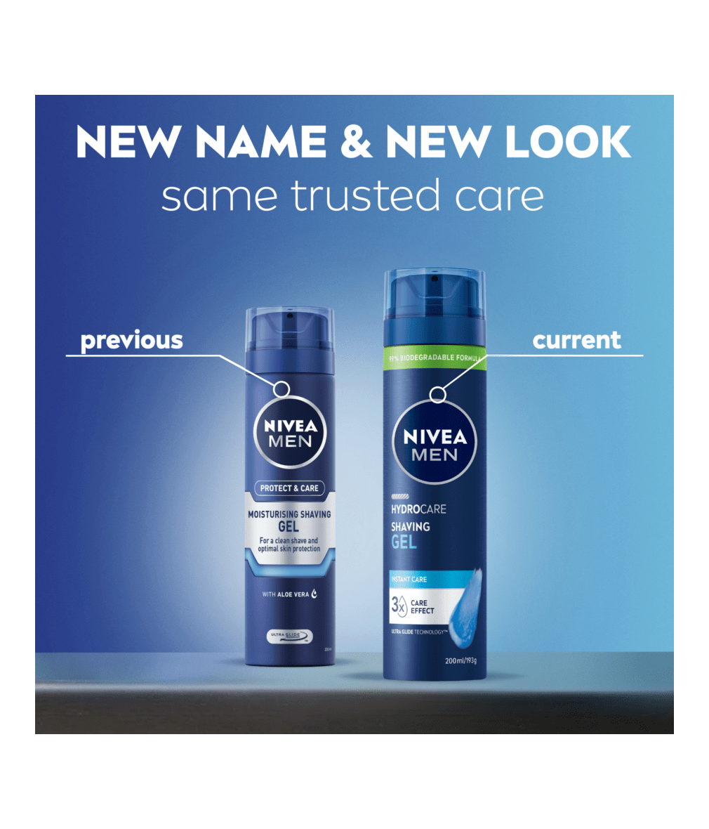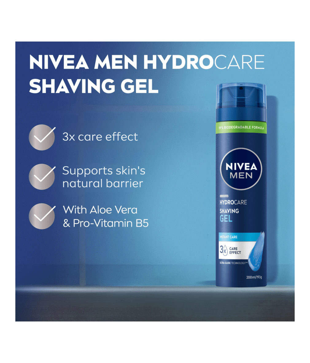 NIVEA MEN HYDROCARE Shaving Gel with Aloe Vera and Pro-Vitamin B5 provides instant care with a 3x Care Effect: smooth gliding, a comfortable shave, and a moisturised skin feel. Ultra Glide Technolog ensures a gentle close shave, protecting the skin from dryness, nicks, and cuts.