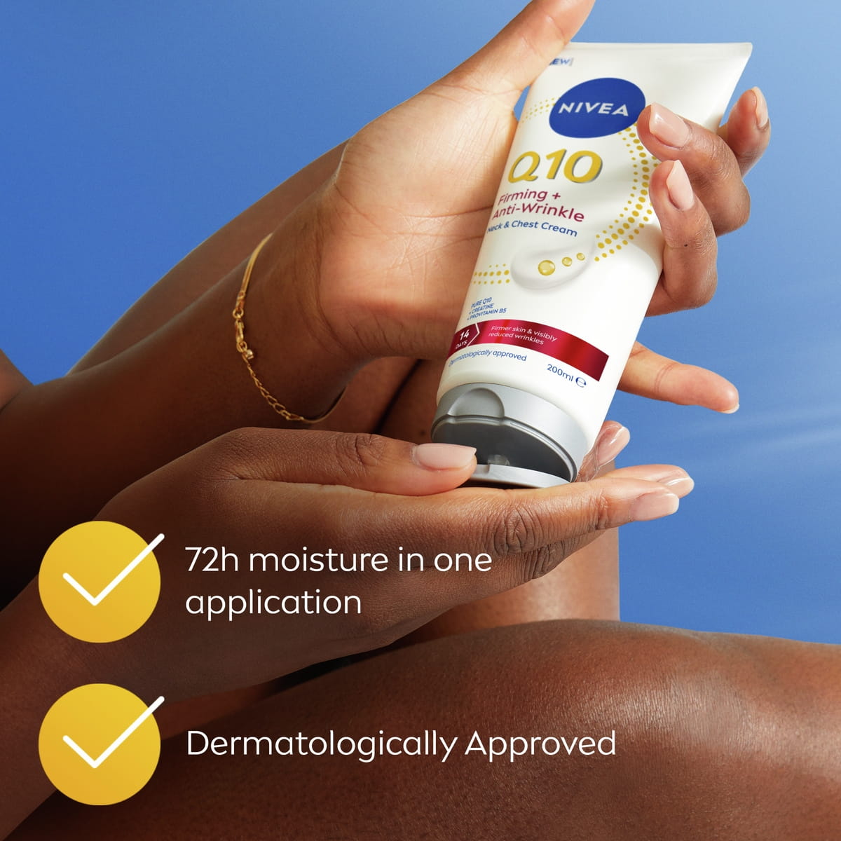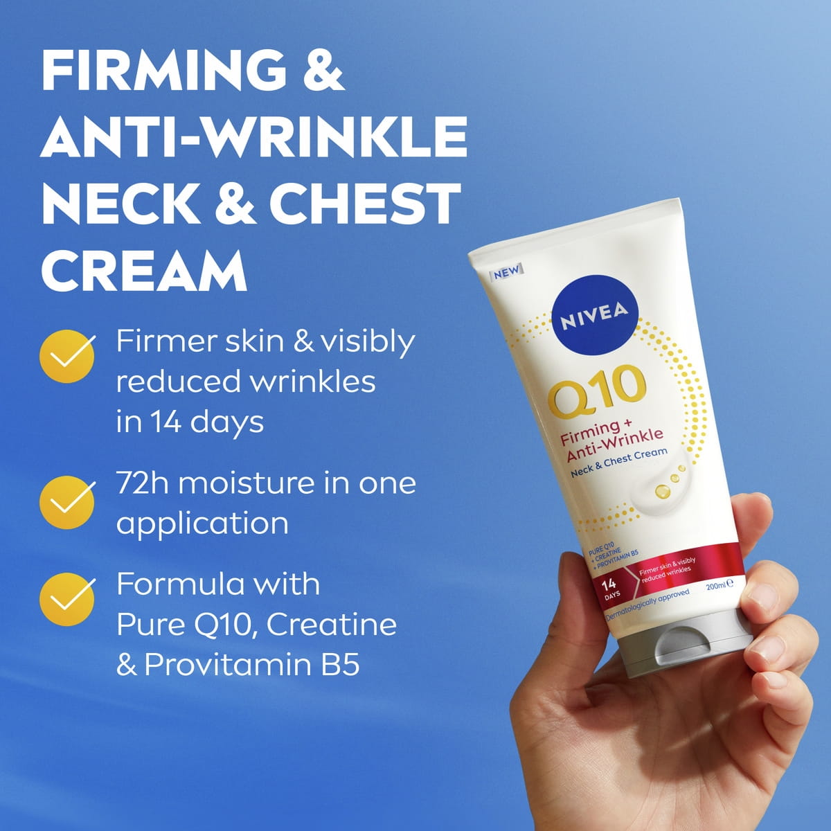 NEW NIVEA Q10 Firming & Anti-Wrinkle Neck & Chest Cream with pure Q10, Creatine and Provitamin B5 is specially developed for the delicate skin on the neck and chest and helps reduce the appearance of fine lines and wrinkle in just 14 days.
