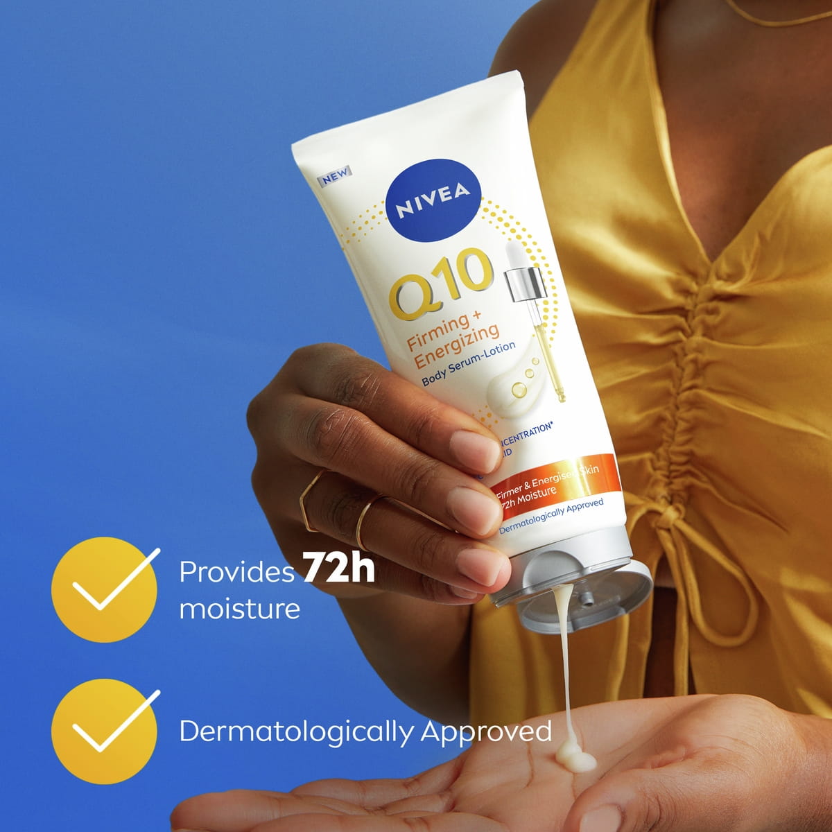 NEW NIVEA Q10 Firming & Energising Body Serum-Lotion with our highest concentration of pure Q10*, Vitamin C and Hyaluronic acid firms the skin in just 7 days & immediately provides energised skin feeling. *Within NIVEA Body assortment