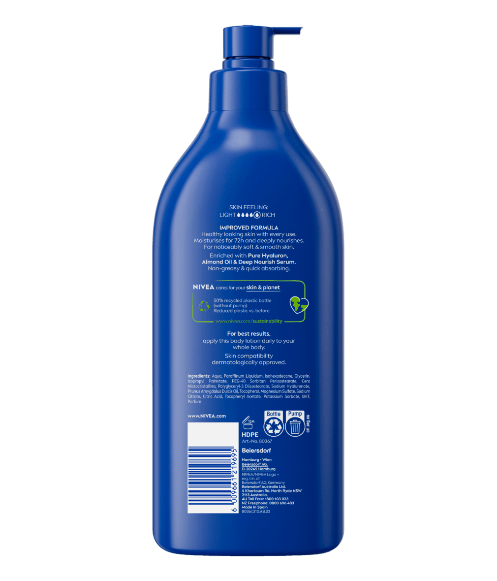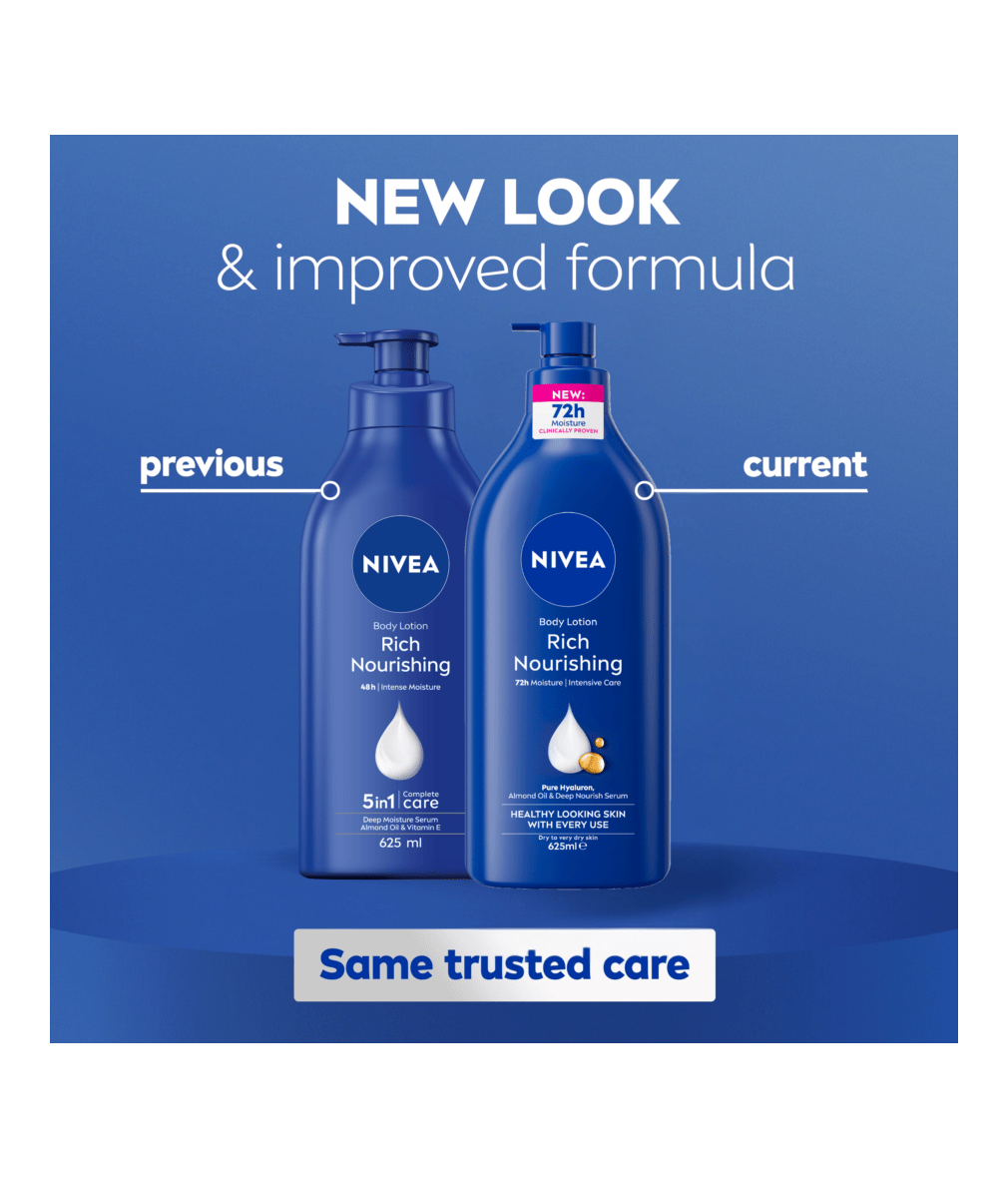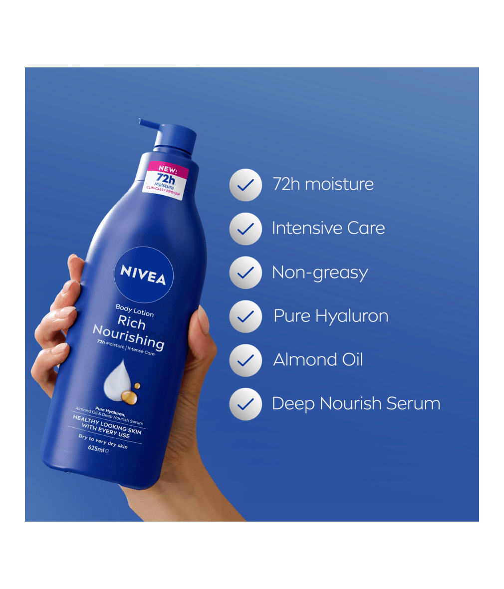 Transform your dry skin with NIVEA Rich Nourishing body lotion, with the new and improved formula that provides clinically proven 72h moisture. For healthy looking skin with every use. Nourishing formula enriched with Pure Hyaluron, Almond Oil and Deep Nourish Serum, this body lotion will deliver intensive care and is perfect for dry to very dry skin. Non-greasy and quick absorbing. Some areas of skin dry out quicker than others. That's why it's important to give it extra nourishment all year round.